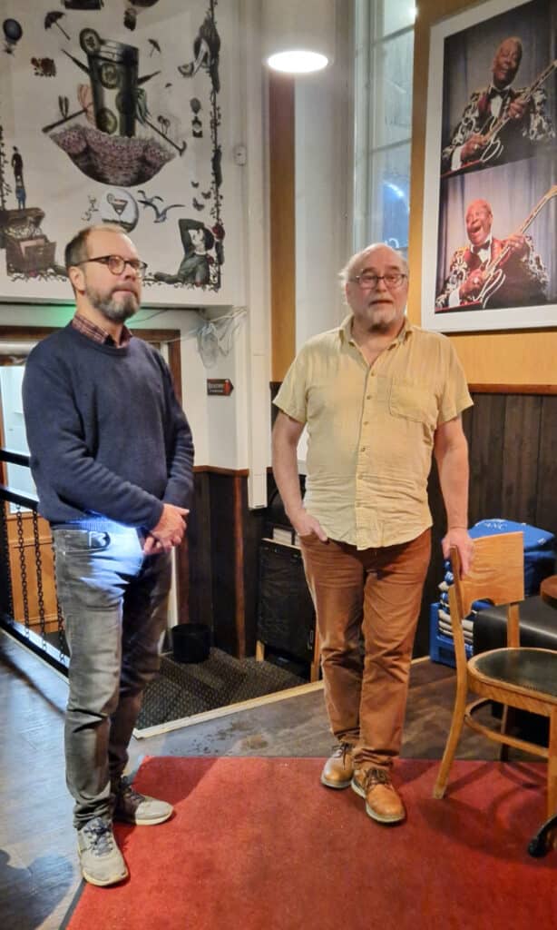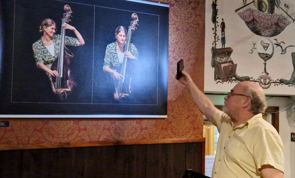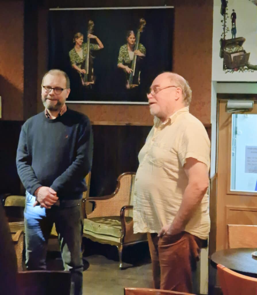 Pitkänlinjan valokuvaaja Juha Tanhua ja Lahti Big Bandin puheenjohtaja, viestintäalan yrittäjä Janne Tarmio olivat koonneet parhaat keikkakuvansa Virastoon näyttelyksi. Klubilaisille he kertoivat kuvaustilanteista ja käyttämästään ”kalustosta”.